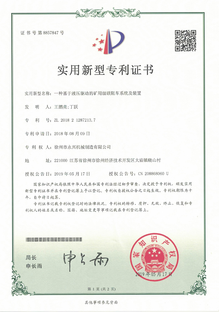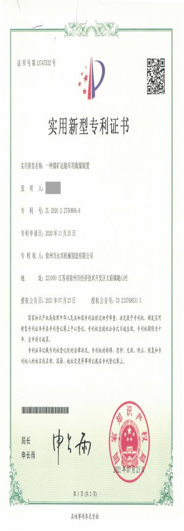 一種煤礦運(yùn)輸車用載煤裝置實(shí)用新型專利證書