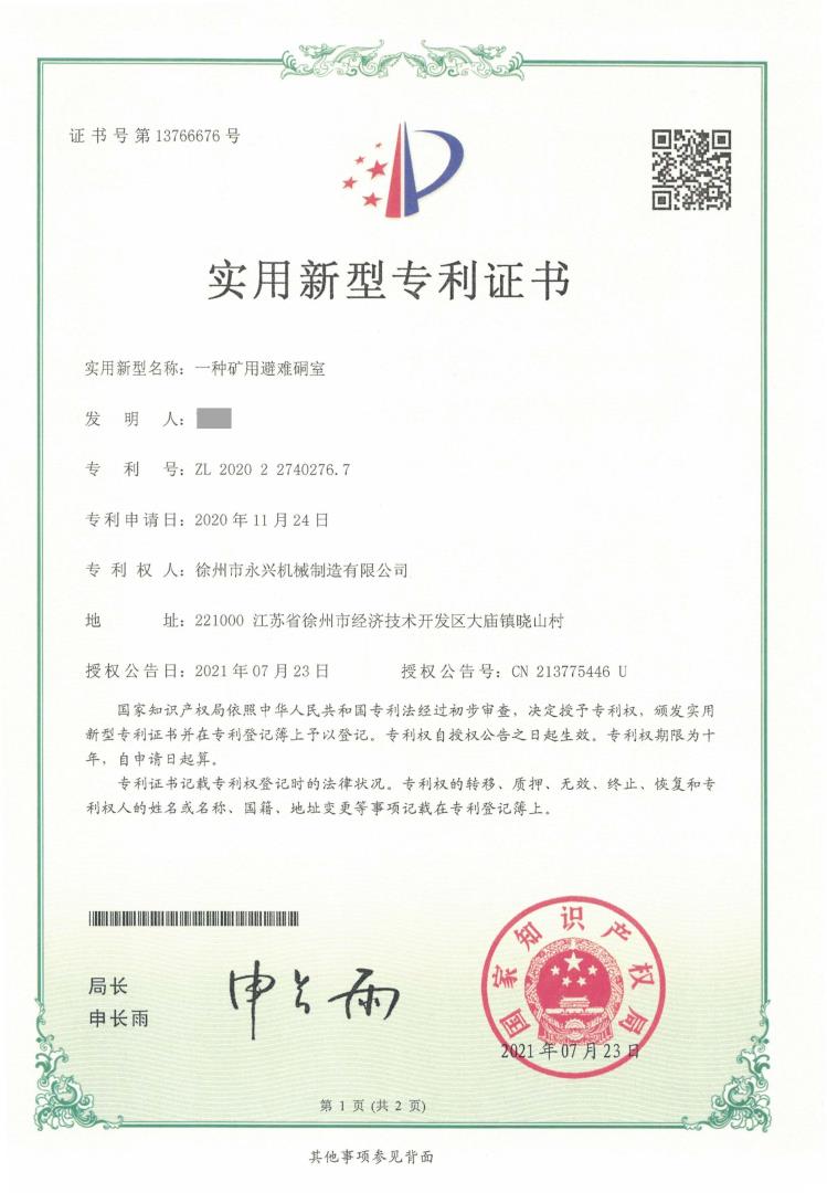 一種礦用避難硐室實(shí)用新型專利證書