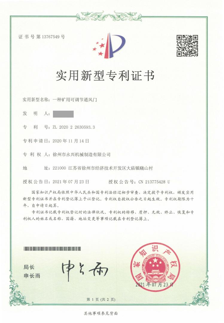 一種礦用可調(diào)節(jié)通風(fēng)門實(shí)用新型專利證書